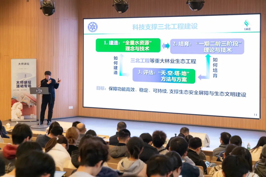 观看了“科普三分钟”视频后,朱教君院士以森林演化史就是人类文明发展史为切入点,重点介绍了三北工程“建造-培育-评估”一体化关键技术,对三北工程与天保工程做出科学、客观、历史性评价,甄别出存在问题及成因。指出人类发展就是一个与自然共生的过程,当前人类正面临气候变化、生物多样性丧失、生态系统退化与环境污染等多重挑战,呼吁生态退化治理必须秉持“山水林田湖草沙”一体化理念为统领,构建以全量水资源为核心约束和复合系统协调度的工程技术体系,从“碳中和”目标入手解决天然林保护面临的多重矛盾,为“山水林田湖草沙”系统治理提供科学技术支撑。